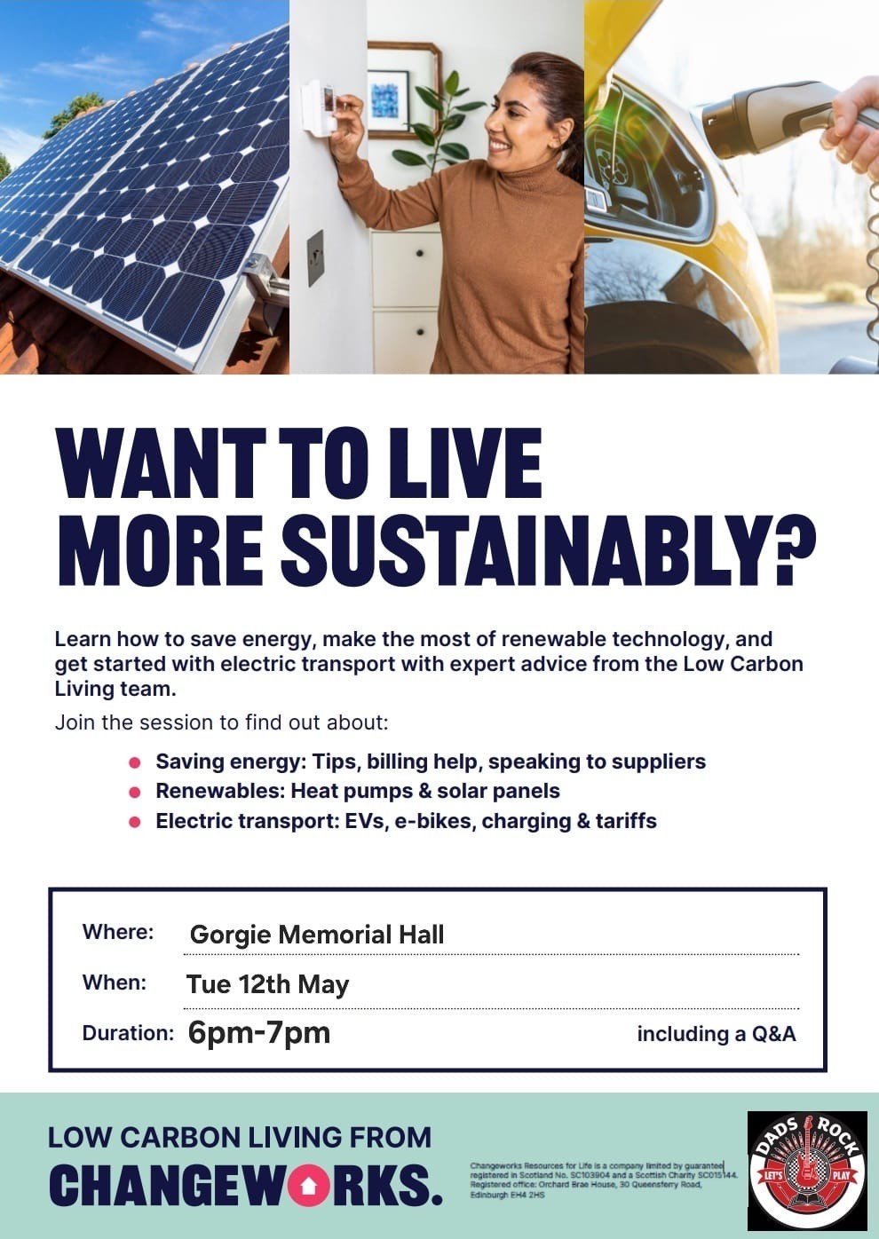We’re excited to be welcoming Changeworks along to our Dads & Dice session in Edinburgh on Tuesday 12th May. They’ll be joining us for an informal chat about all things low carbon living - sharing practical tips on saving energy, understanding bills, and exploring options like solar panels, heat pumps and electric transport.